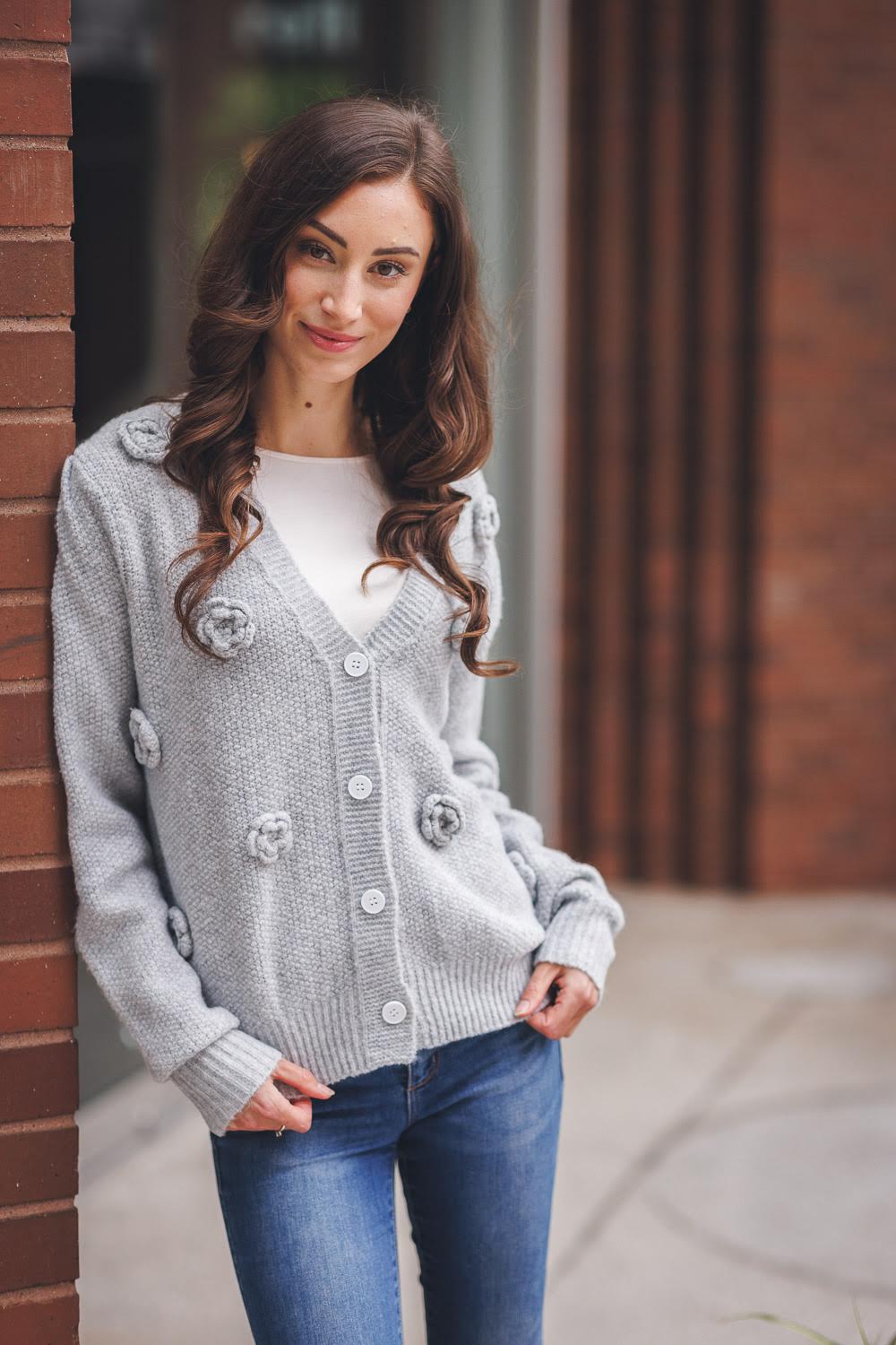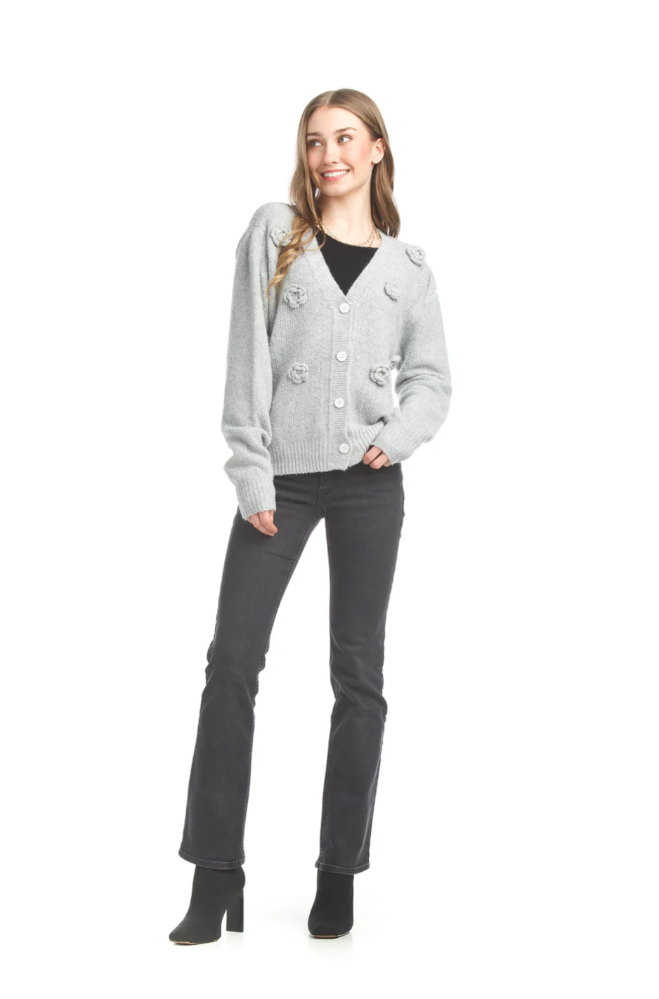 Bring a playful pop of charm to your wardrobe with the 3D Rose Cardigan in Grey. This cozy yet chic piece effortlessly transforms casual outfits into stylish statements and adds a whimsical touch to dressier ensembles. Its unique 3D rose detailing invites compliments, making every look bloom with personality. Perfect for layering, it’s your go-to for a fun twist on everyday elegance.