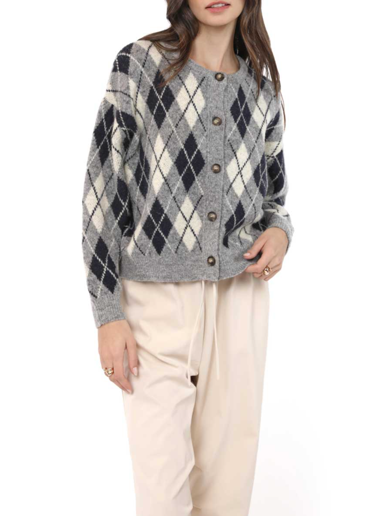 Wrap yourself in cozy charm with the Bec Argyle Sweater Cardigan. This grey multi-colour classic features a playful twist on the timeless argyle pattern, perfect for adding a dash of personality to your everyday look. Soft and snug, it’s your new go-to for layering with flair and comfort.