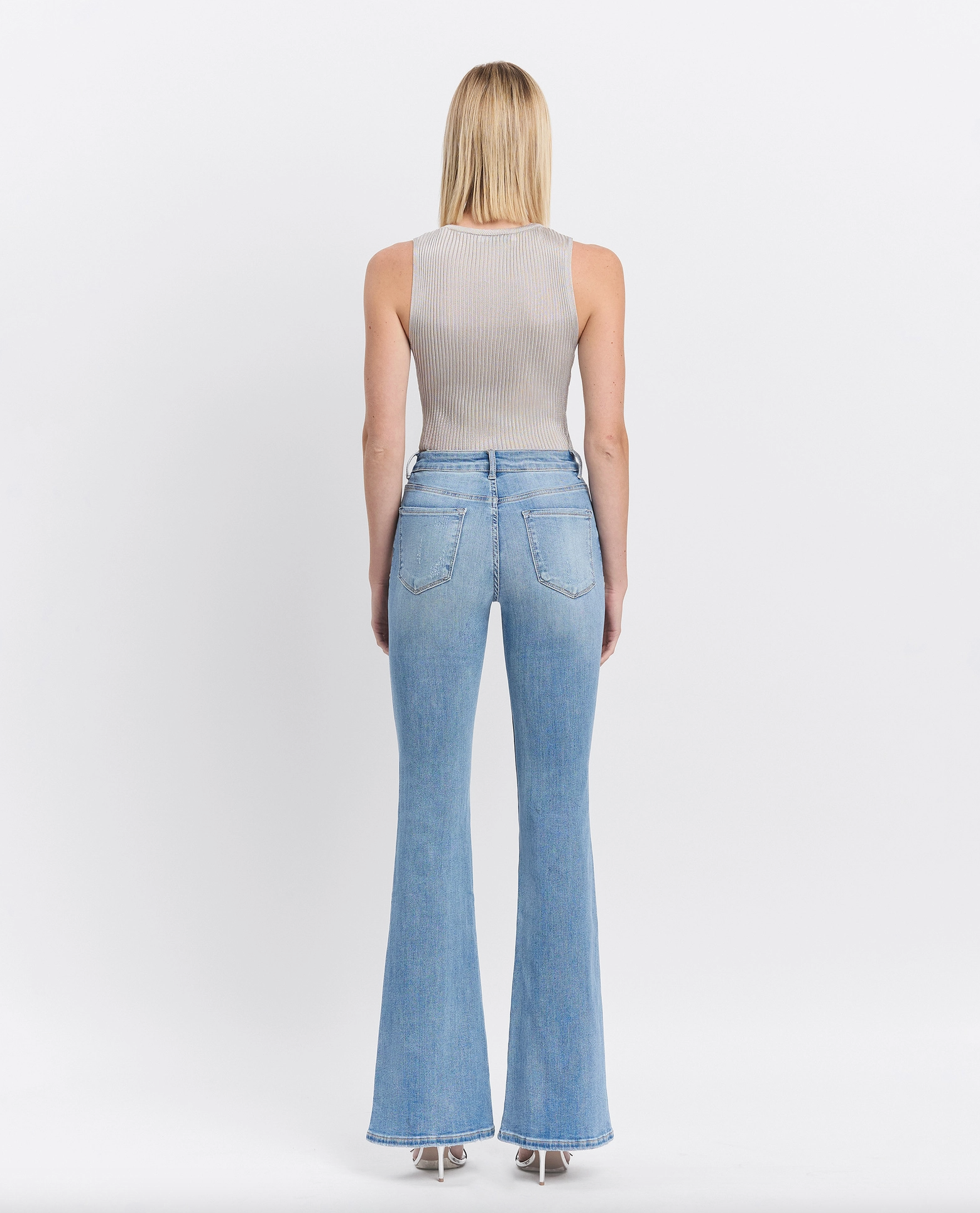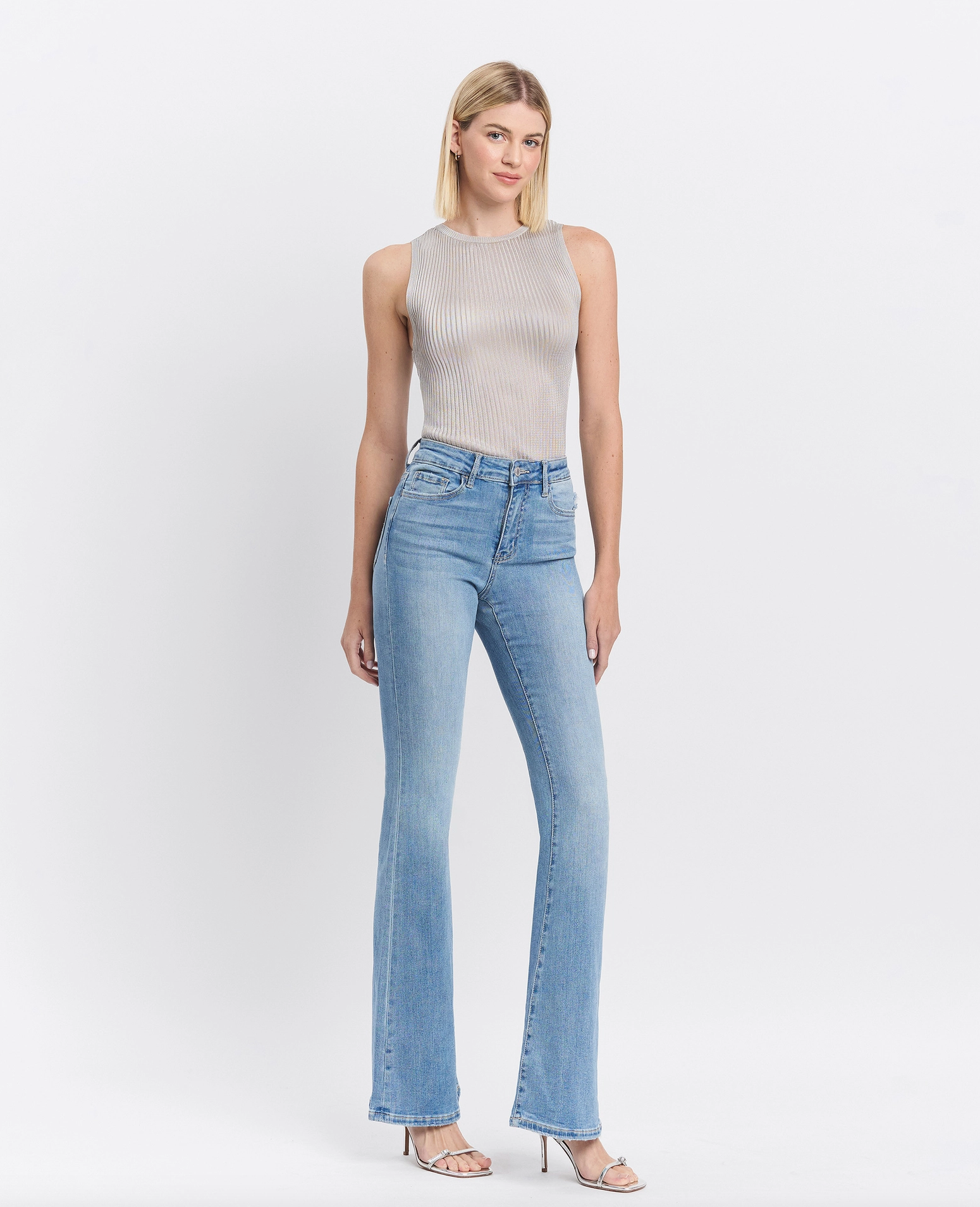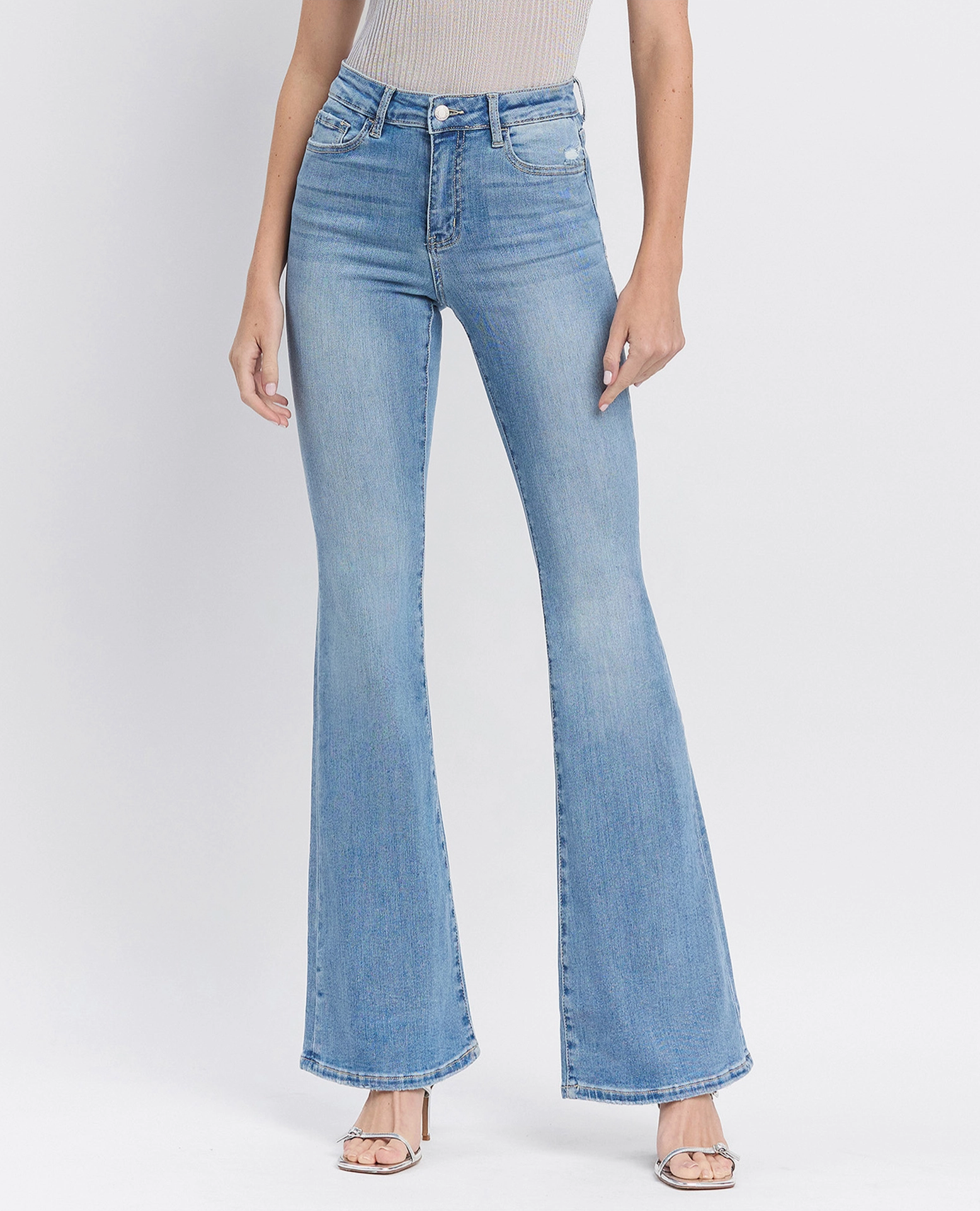 High rise long flare jeans Comfort stretch denim, high rise waist, 5 pockets, finished hem, full length, medium light wash, flare jeans F. Rise: 10" / inseam: 34" / leg opening: 22"