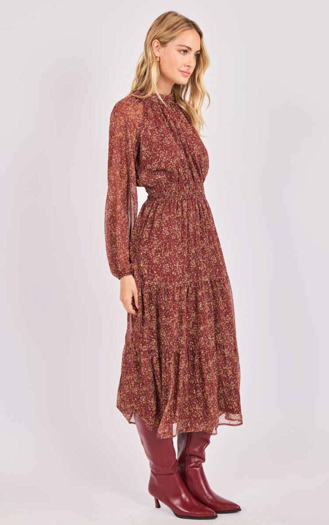 Elevate your wardrobe with this refined mockneck midi dress, designed for understated elegance. The tiered silhouette creates graceful movement and visual interest, while the mockneck offers a polished, contemporary finish. Perfect for transitional seasons, this piece effortlessly bridges casual and formal occasions. The midi length provides versatile styling options—pair with heels for evening sophistication or flats for refined daytime wear. A timeless addition to any discerning wardrobe.