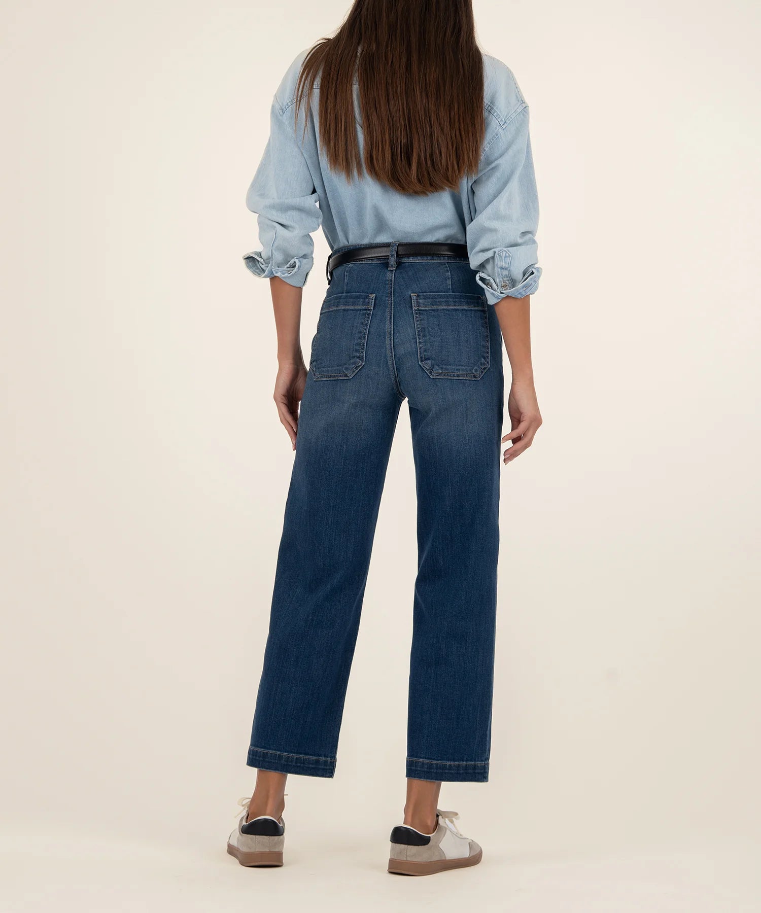 - Step up your denim game with these high-rise wide leg jeans in a flattering dark wash. Designed with porkchop pockets, a wide hem, and made from stretchy material, they offer both style and comfort. The structured silhouette and rich color make them a standout choice for any day of the week.