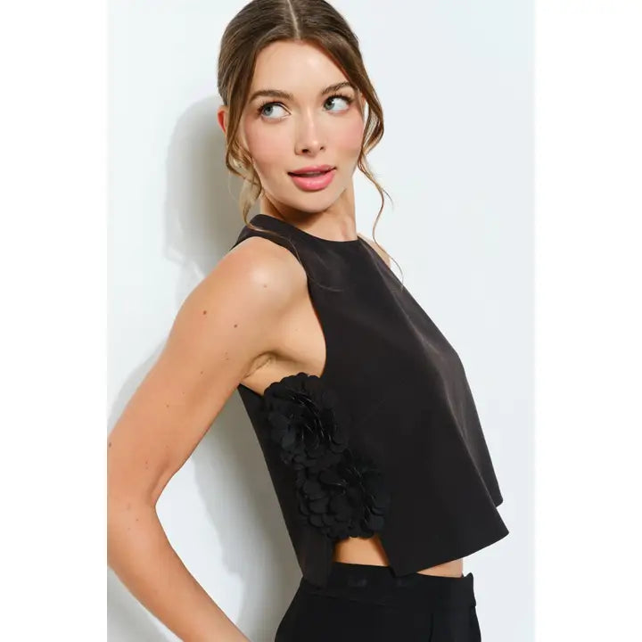 Add a touch of whimsy to your wardrobe with this Floral Applique Sleeveless Top. Featuring delicate black floral appliques, it’s perfect for sunny days and playful evenings. Lightweight and breezy, this top keeps you cool while turning heads wherever you go. Pair it with your favorite jeans or a flirty skirt for effortless charm.