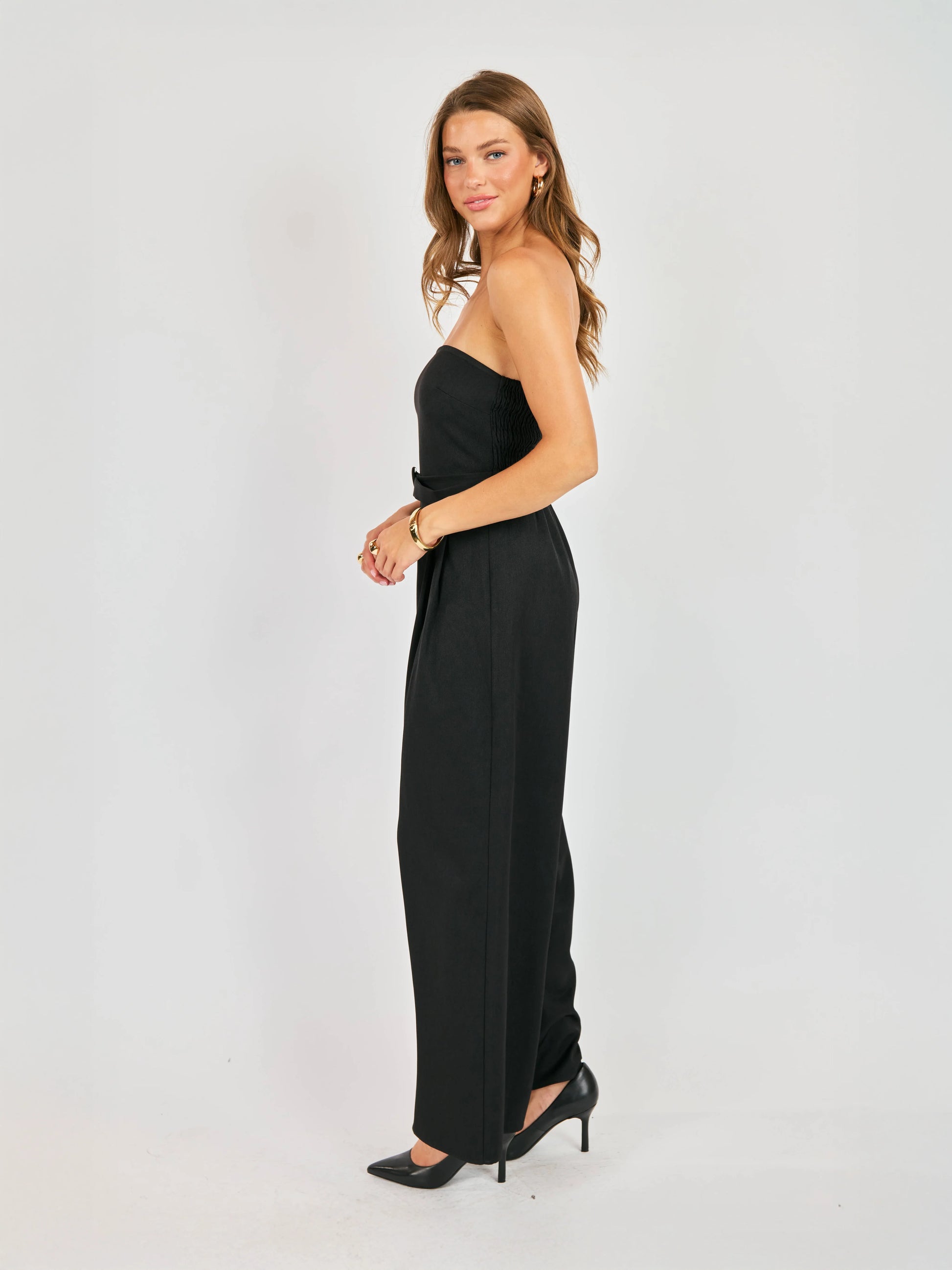 This black Royale Tube Jumpsuit features a sleek, strapless bodice and a structured wide-leg frame.